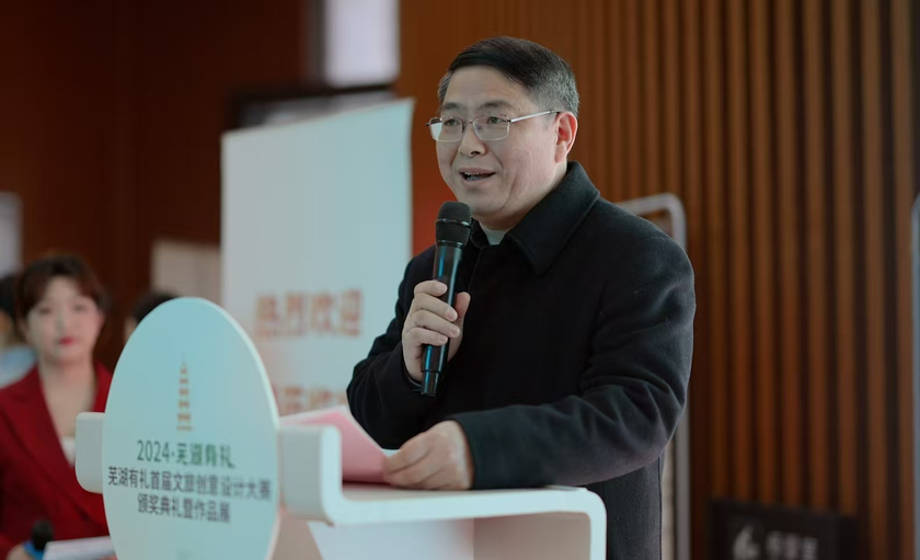 王成军在致辞中回顾了我校参与筹备及组织大赛过程,对政府、企业、高校等各界支持表达了感谢,并向获奖选手及单位表示祝贺。他对芜湖市文化旅游产业未来的发展繁荣充满期待,希望设计学院持续发挥学科专业优势,为服务推动芜湖市文化创意产业发展作出贡献。